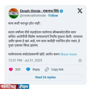 फडणवीसांशिवाय राज्याचे उपमुख्यमंत्री एकनाथ शिंदे यांनीदेखील निकालावर एक्सवर पोस्ट केली आहे. ते म्हणतात की, सत्य कधी पराभूत होत नाही : सतरा वर्षांच्या दीर्घ लढाईनंतर मालेगाव बॉम्बस्फोटातील सात कथित आरोपींची विशेष न्यायालयाने निर्दोष मुक्तता केली. न्यायाला उशीर झाला हे खरं आहे, पण सत्य कधीही पराजित होत नसतं, हे पुन्हा एकवार सिध्द झालंय. मालेगावच्या स्फोटांप्रकरणी खोटे आरोप करुन तुरुंगात डांबण्यात आलेल्या देशभक्तांना शिवसेनेनं पहिल्यापासूनच निसंदिग्ध पाठिंबा दिला होता. कारण आपली बाजू न्यायाची आहे, याबद्दल शिवसेनेला कधीही संदेह नव्हता.
