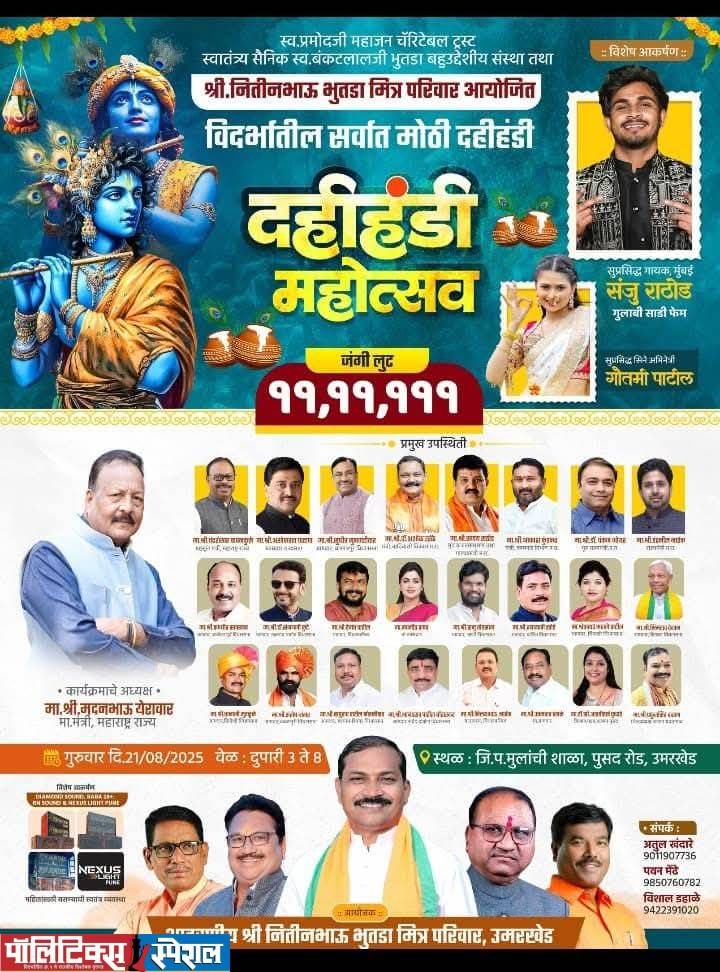 रितेश पुरोहित पॉलिटिक्स स्पेशल लाईव्ह यवतमाळ ९४२३७०३८३१ यवतमाळ जिल्हा महाराष्ट्रा मध्ये आत्महत्याग्रस्त जिल्हा म्हणून ओळखल्या जातो. मराठी नटी आणून स्टेजवर नाचवण्यात हा या दहीहंडीचा मोठा... Read More