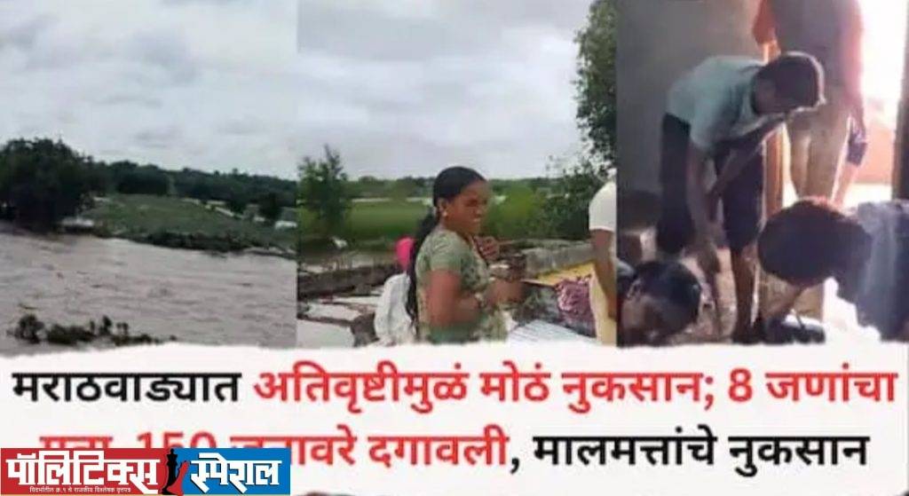 पॉलिटिक्स स्पेशल लाईव्ह मुंबई :- “मराठवाड्यात सोमवारी सकाळी संपलेल्या २४ तासांत ७५ मंडलांमध्ये अतिवृष्टी झाली. अनेक ठिकाणी नद्या-नाल्यांना पूर आला असून, चार जणांचा मृत्यू झाला... Read More